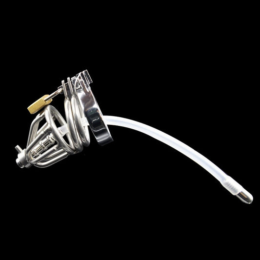 Metal Inverted Chastity Cage with Detachable Urethral Tube and Small Dildo